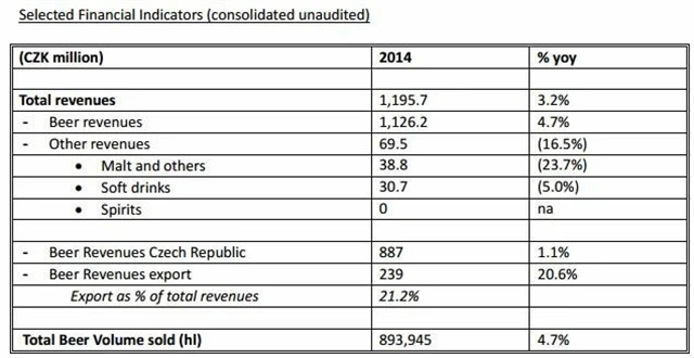 Tržby za 4. kvartál 2014 stouply o 7,3 % meziročně na 272 milionů korun, zatímco tržby z prodeje piva vzrostly o 10,1 % meziročně na 267 milionů Kč díky 8,8% meziročnímu nárůstu produkce piva na 894 tisíc hektolitrů.