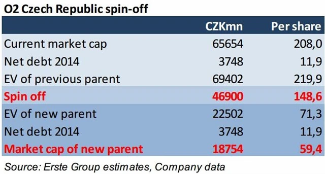 "Podle našich odhadů a kalkulací by cena akcií O2 C.R. měla po rozdělení spadnout na asi 59,4 Kč. Každý akcionář O2 C.R. by ke každé své akcii obdržel ještě 1 akcii Nástupnické společnosti v hodnotě 148,6 Kč na akcii. Tyto akcie ale nebudou veřejně obchodovatelné. Nástupnická společnost má povinnost odkoupit tyto akcie za cenu, která podle našich předpokladů bude založena na ocenění aktiv v objemu 148,6 Kč určených k vyčlenění. Podle našeho názoru se v zásadě jedná o stažení 71 % O2 C.R. z burzy s odkupní cenou 148,6 Kč," uvedla analytička z vídeňské Erste Veronika Sutedja. "Na základě nám dostupných informací nejsme schopni říci, zda ocenění Nástupnické firmy je férové. Doporučovali bychom akcionářům O2 C.R. nabídku odkupu přijmout. Nevidíme důvod, proč držet neobchodovatelné akcie."