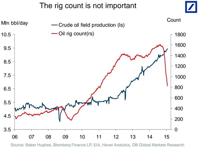 Aktivních ropných vrtů v USA stále ubývá, produkce ropy ale roste. Zavírány jsou totiž ty nejméně efektivní vrty. Analytici z Goldman Sachs ale varují, že letos americká produkce zažije pokles a oživí až v roce 2016. Tak uvidíme.