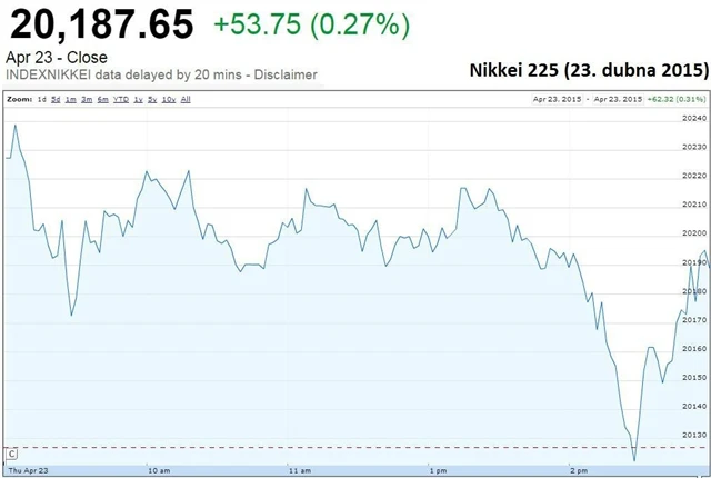 Japonský Nikkei 225 posílil o 0,27 % a postoupil dále nad hranici 20 tisíc bodů, čímž druhý den v řadě zaznamenal 15leté maximum. Dařilo se především makléřským firmám a pojišťovnám.