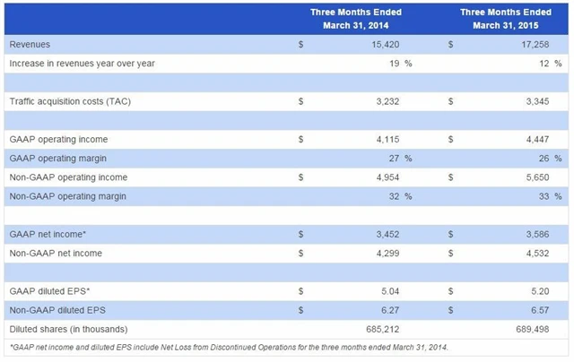 Analytici očekávali, že tržby společnosti Google dosáhnou 17,5 miliard dolarů, a čtvrtletní výsledky tak zůstaly mírně za jejich očekáváním. Ve stejném období loňského roku činily tržby firmy 15,42 miliard dolarů. Google bojuje s konkurenty jako Facebook nebo Yahoo o příjmy z internetové reklamy.