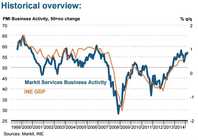 Aktivita španělského sektoru služeb v březnu opět zrychlila. Index nákupních manažerů vyskočil na 57,3 bodu z únorových 56,2 bodu, tedy na nejvyšší hladinu od loňského srpna, především díky prudkému přílivu nových firem do odvětví, který byl nejsilnější od července 2000, a novým zakázkám, které rovněž zaznamenaly nejprudší nárůst od července 2000. Zaměstnanost v sektoru se výrazně zvýšila, a to nejprudším tempem od listopadu 2007. Kompozitní index se zvýšil na 56,9 bodu z 56 bodů. I situace ve zpracovatelském sektoru se v březnu zlepšila, byť jen minimálně - index vzrostl na 54,3 bodu z únorových 54,2 bodu.