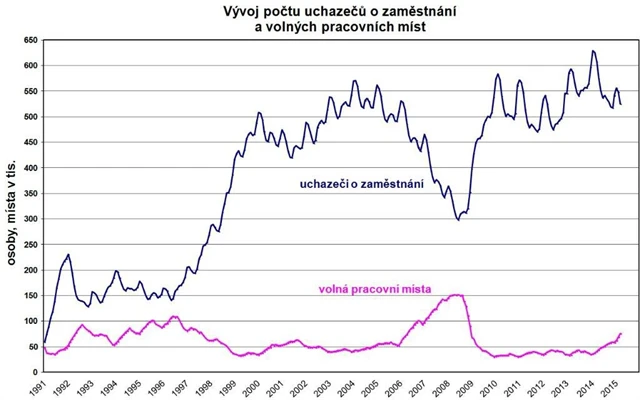 Podíl nezaměstnaných osob, tedy počet dosažitelných uchazečů o zaměstnání ve věku 15-64 let k obyvatelstvu stejného věku k 31. březnu poklesl na 7,2 % (únor 2015: 7,5 %, březen 2014: 8,3 %). Podíl nezaměstnaných stejný nebo vyšší než republikový průměr vykázalo 35 okresů, nejvyšší byl v okresech Bruntál (12,9 %), Most (12,7 %), Ústí nad Labem (12,2 %), Karviná (12,0 %), Jeseník (11,2 %), Ostrava–město (10,9 %) a Chomutov (10,8 %). Nejnižší podíl nezaměstnaných byl zaznamenán v okresech Praha-východ (3,2 %), Rychnov nad Kněžnou a Mladá Boleslav (shodně 4,1 %), Benešov a Praha-západ (shodně 4,2 %) a Rokycany (4,3 %). Podíl nezaměstnaných mužů poklesl na 7,3 % a podíl nezaměstnaných žen poklesl na 7,1 %. Podle posledních dostupných údajů sezónně neočištěná míra nezaměstnanosti zpracovávaná Eurostatem pro mezinárodní srovnání byla v únoru 2015 v ČR 5,9 %, v EU28 10,3 %. Sezónně očištěná míra nezaměstnanosti byla v ČR 5,5 % a v EU28 9,8 %.