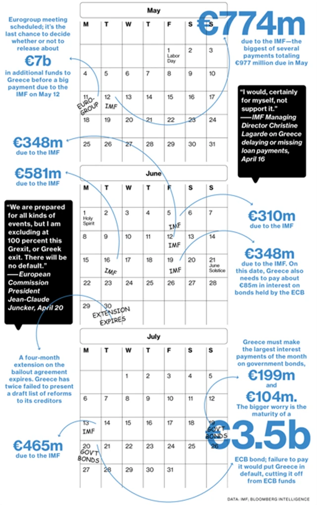 Řecko nemá přístup na dluhopisové trhy a jeho mezinárodní věřitelé mu odmítají vyplatit zbývající peníze ze záchranného programu, pokud se nezaváže k dalším reformám. Zadlužená země musí mezitím splácet své dluhy. Jenom příští měsíc ji čekají čtyři dlužné splátky Mezinárodnímu měnovému fondu (MMF) v celkové výši 1,6 miliardy eur. První splátku 300 milionů eur mají Atény uhradit 5. června.