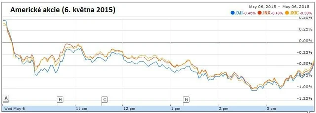 Index Dow zakončil obchodování v poklesu o 0,48 % na 17 841,98 bodu, širší index S&P 500 klesl o 0,45 % na 2 080,15 bodu. Technologický Nasdaq ztratil 0,40 % na 4 919,64 bodu. Index volatility VIX posílil o 5,87 % na 15,15 bodu.