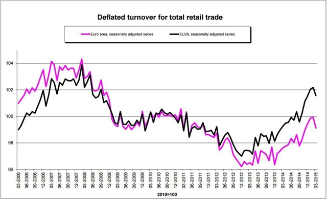 Meziměsíční pokles o 0,8 % v eurozóně vyvolal z největší části 2,7% pokles v oblasti pohonných hmot, 0,8% pokles v nepotravinářském sektoru a 0,6% pokles v odvětví potravin, nápojů a tabáku. V celé Evropské unii 0,6% pokles vyvolal především 2,9% propad tržeb z pohonných hmot, 0,5% pokles nepotravinářského sektoru a 0,3% pokles v odvětví potravin, nápojů a tabáku.