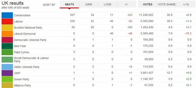 Na první pohled zaujme více než 50 křesel pro Skotskou národní stranu (mluví se o vysoké pravděpodobnosti dalších ústupků Londýna směrem ke samosprávě Skotska) a pouhé 1 získané křeslo dosud Farageovy UKIP, která přitom získala třetí největší počet hlasů.
