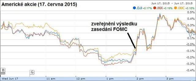 Nakonec Dow posílil o mírných 0,17 % na 17 935,14 bodu, S&P 500 zpevnil o 0,20 % na 2 100,43 bodu a Nasdaq se zvýšil o 0,18 % na 5 064,88 bodu. Index volatility VIX klesl o 2,16 % na 14,49 bodu. V zisku skončilo devět z deseti hlavních sektorů, jako jediné zůstaly v mírném záporu finanční tituly, jimž neprospěl výhled celkově pomalejšího růstu sazeb v USA ze strany centrální banky. Celkově analytici hodnotí pro akcie kladně to, že Fed chce sazby zvyšovat postupně a podle současných očekávání pomaleji, než se předpokládalo. Proti vyšším cenám akcií ale - ne historicky, ale podle dosavadního dění na trzích - hovoří potvrzené odhodlání guvernérů přistoupit ke zvýšení úroků ještě letos.