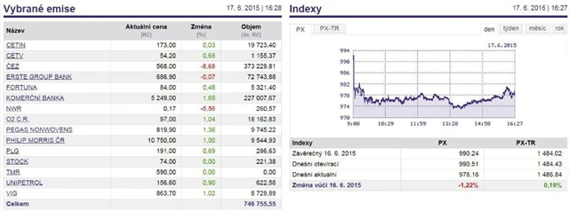 Index PX ve středu odepsal 1,22 % na 978,16 bodu. Index PX-TR očištěný o vyplacené dividendy naopak posílil o 0,19 %.