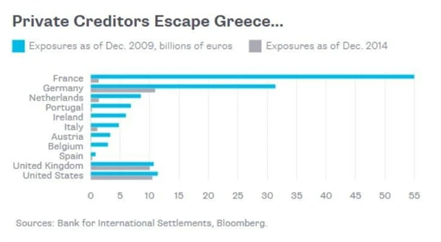 Od chvíle, kdy řecká krize poprvé vystrčila růžky v roce 2010, zemi pomáhaly ostatní evropské národy, které Řecku půjčovaly na to, aby mohlo hradit své závazky, a nahrazovaly tak postupně soukromé investory. Díky tomuto kroku mají nyní banky a soukromí investoři v sázce mnohem méně. Z následujícího grafu vyplývá, jak poklesla jejich expozice vůči řeckému dluhu oproti roku 2009.