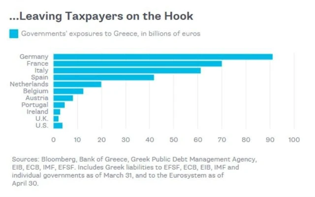 Na druhou stranu evropské vlády už na tom tak dobře nejsou - německá obzvlášť. Staly se totiž největším držitelem řeckého dluhu, jenž dosahuje objemu 313 miliard eur, a toto břemeno tudíž dopadne především na jejich daňové poplatníky. Nemluvě o tom, že Evropská centrální banka do dubna půjčila řeckým bankám 115 miliard eur, aby jim pomohla pokrýt velký odliv likvidity. Tato půjčka se však rychle může stát odepsanou ztrátou, jež padne na zbývající členy ECB, pokud Řecko opustí eurozónu.