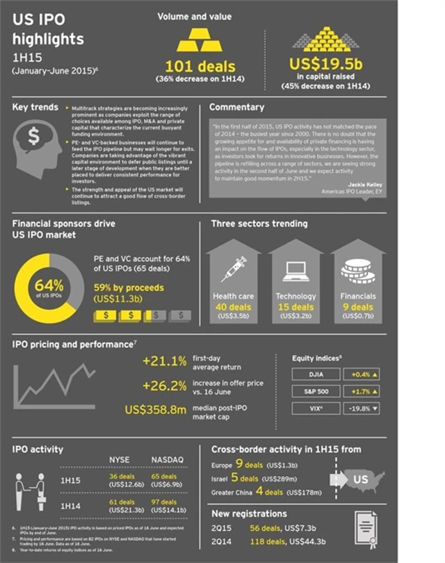 Celkově byla aktivita v oblasti IPO na americkém trhu v prvním pololetí utlumená, a to mimo jiné kvůli zpomalení ekonomické expanze Spojených států, respektive mezikvartálnímu poklesu HDP v prvních třech měsících roku. Roli ale sehrála i nejistota kolem budoucího nastavení úrokových sazeb v USA. Sluší se navíc připomenout, že loňský rok byl z pohledu primárních úpisů ve Spojených státech nejživelnější od roku 2000, kdy splaskla internetová bublina.