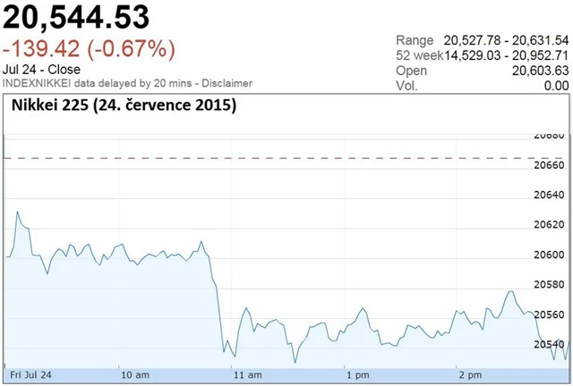 Předběžný čínský výrobní index nákupních manažerů trhy zaskočil výrazným poklesem. Ukazatel klesl na 48,2 bodu, což je nejnižší hodnota za patnáct měsíců. Podle analytiků to může být způsobeno nedávnými propady na čínských akciových trzích a slabší exportní poptávkou. Agentura AP uvedla, že je pokles indexu další známkou zhoršujícího se stavu čínské ekonomiky.
