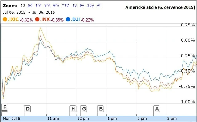 Americké akcie v pondělním obchodování oslabovaly kvůli obavám ohledně Řecka. Náladu na trhu nicméně podpořilo prohlášení Mezinárodního měnového fondu, že je připraven Řecku pomoci. Řekové v nedělním referendu odmítli podmínky věřitelů pro poskytnutí finanční pomoci, investoři nicméně stále doufají, že bude dosaženo dohody, která odvrátí odchod Řecka z eurozóny.