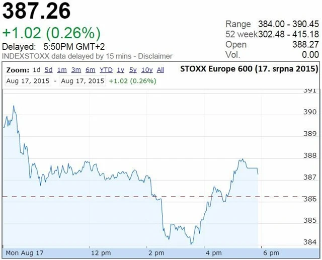 Evropské akcie se v pondělí dopoledne pohybovaly kolem nuly, v druhé polovině seance ale spadly do červených čísel poté, co nečekaně slabá data z amerického zpracovatelského sektoru obnovila obavy z toho, že světová ekonomika není dostatečně silná na to, aby ustála růst sazeb v USA. Britské a francouzské akcie ještě v závěru dokázaly ztráty smazat, burza v Německu se již ale z poklesu nevzpamatovala.