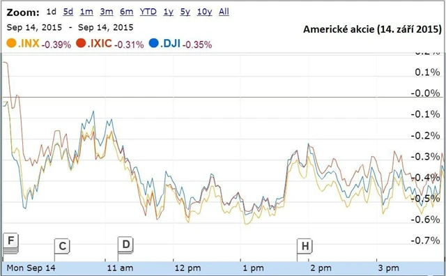 Americké akcie v pondělí oslabily, negativní dopad na ně měly pokračující obavy ze zpomalování růstu čínské ekonomiky. Investoři také čekají, jak dopadne dvoudenní zasedání měnového výboru americké centrální banky, které začne ve středu a skončí ve čtvrtek. Otazník zůstává nad tím, zda Fed poprvé po devíti letech zvýší úrokové sazby.