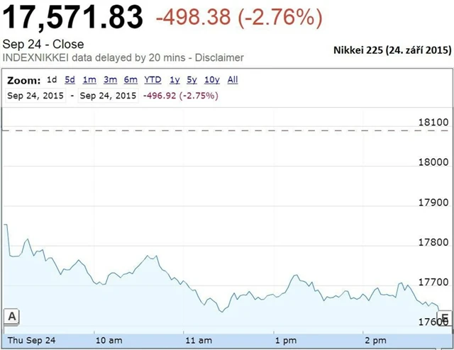 Index nákupních manažerů ve zpracovatelském sektoru podle předběžných dat v září klesl na 50,9 bodu z 51,7 bodu v srpnu. Sice se tak stále drží nad padesátibodovou hranicí dělící kontrakci od expanze, avšak zároveň se jedná o první pokles za poslední tři měsíce. Japonský Nikkei 225 odepsal ve čtvrtek 2,8 % a zakončil tak na novém dvoutýdenním minimu. Dolů ho stahovaly především automobilky a finanční sektor.