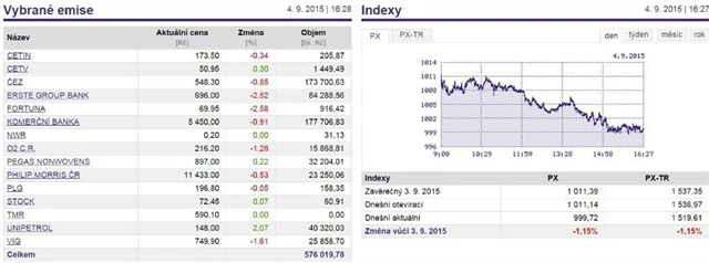 Index PX v pátek odevzdal 1,15 % a spadl tak opět pod hranici tisíce bodů na 999,72 bodu. Za celý týden index odevzdal 1,3 %.