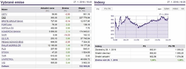 Největšího zobchodovaného objemu ve středu dosáhly cenné papíry energetické skupiny ČEZ, jejichž cena vzrostla o 2,85 % na 393,30 Kč. Druhé v pořadí byly podle zobchodovaného objemu akcie Komerční banky, které přidaly 2,14 % na 5 056 korun, a třetí byly cenné papíry Unipetrolu (+2,25 % na 165,55 Kč), který ve čtvrtek ráno zveřejní hospodářské výsledky za poslední tři měsíce loňského roku a celý rok 2015. Analytici čekají rekordní čísla.