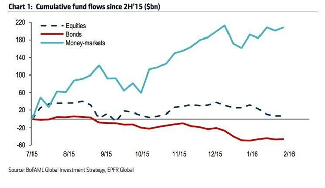 Podle zprávy Bank of America Merrill Lynch (BoAML), vycházející z toků peněz ve fondech investujících do různých tříd aktiv, investoři po celém světě od loňského července do akcií navíc poslali jen zhruba sedm miliard dolarů. Z fondů investujících do pevně úročených aktiv dokonce 46 miliard dolarů vybrali, primárně kvůli přetrvávajícímu nízkoúrokovému prostředí, které pevně úročeným aktivům nenahrává.
