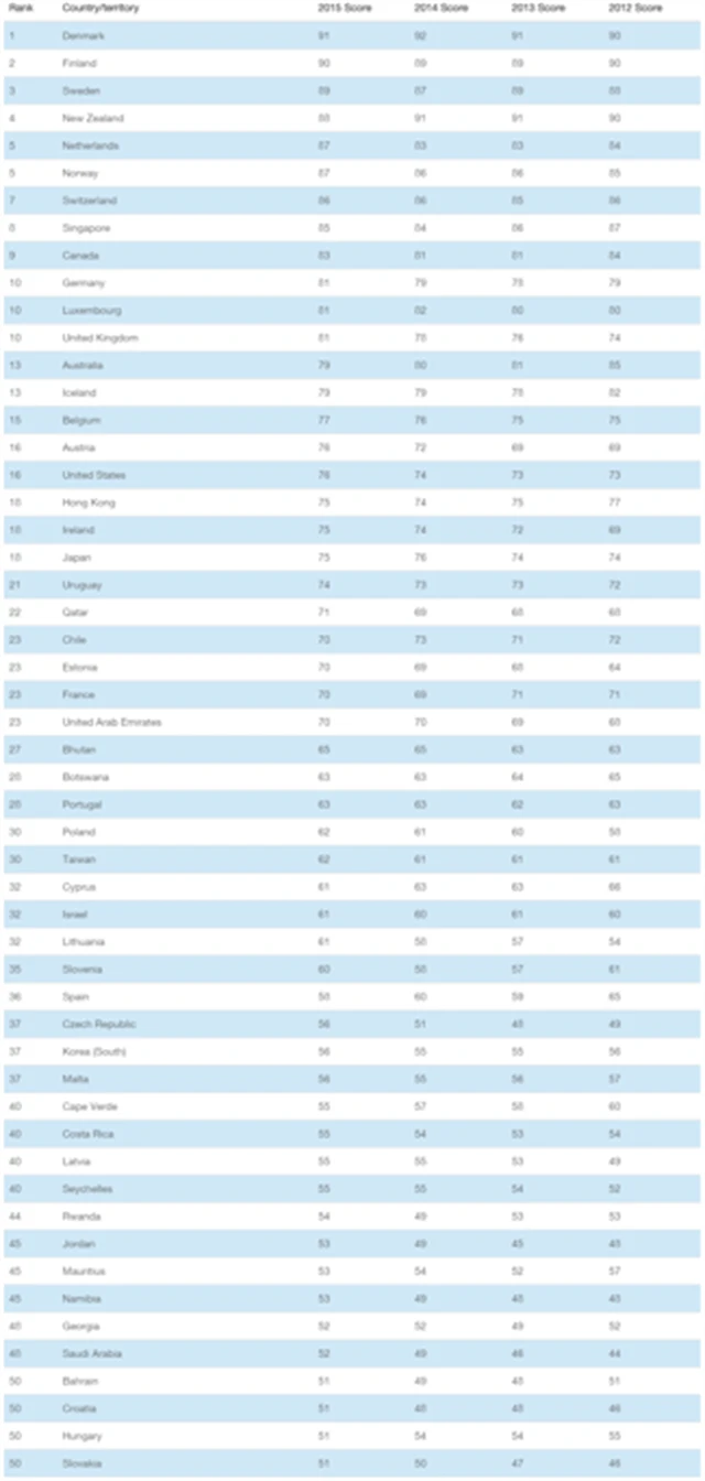 Na vrcholu žebříčku za rok 2015 skončilo stejně jako o rok dříve Dánsko. Na druhé místo se postavilo Finsko, které si meziročně polepšilo o jednu příčku, třetí pak je v aktuálním žebříčku Švédsko, které rovněž postoupilo o jednu pozici výše, čtvrtý Nový Zéland, který naopak o dvě pozice spadl, a páté skončilo Nizozemsko, které v žebříčku za rok 2014 skončilo na osmé příčce.