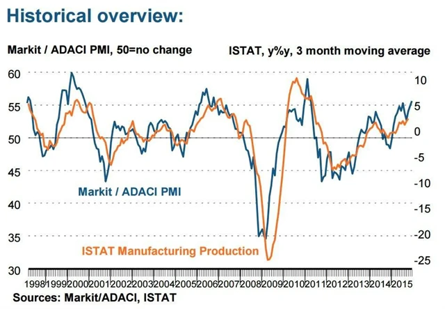 Aktivita v italském zpracovatelském sektoru v prosinci výrazně vzrostla, index nákupních manažerů zde vyskočil na 55,6 bodu z předchozích 54,9 bodu, očekávala se stagnace na listopadové hladině.