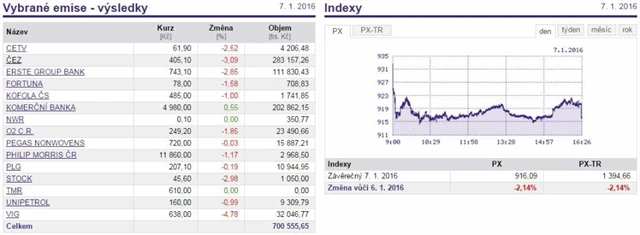 Pražská burza hned v úvodu čtvrtečního obchodování klesala o více než dvě procenta. Reagovala tak na vývoj na dalších evropských trzích, které do červených čísel poslaly čínské burzy, na nichž došlo tento týden k druhému přerušení obchodování z důvodu poklesu akcií o více než sedm procent. Index PX ve čtvrtek nakonec spadl o 2,14 % na 916,09 bodu, nejnižší úroveň od října 2014.