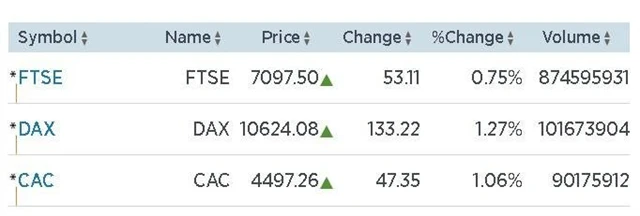 Index londýnské burzy FTSE 100 si připsal 0,75 %, německý DAX přidal 1,27 % a francouzský CAC 40 si polepšil o 1,06 %. Celoevropský index STOXX Europe 600 zakončil seanci se ziskem 0,69 % na 341,98 bodu.