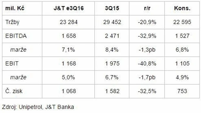 Ve třetím čtvrtletí roku 2015 vykázal Unipetrol čistý zisk zhruba 1,6 miliardy korun. Odhadovaný pokles tak činí přes 78 %. Hlinomaz odhaduje, že firmě meziročně klesnou i tržby, a to o necelou čtvrtinu na 22,4 miliardy korun. Nižší než v loňském roce podle něj budou i úhrnné výsledky společnosti od ledna do září. Čistý zisk za toto období by měl klesnout zhruba o polovinu na 3,42 miliardy korun, výnosy pak o necelých 30 % na 60,6 miliardy korun, dodal.