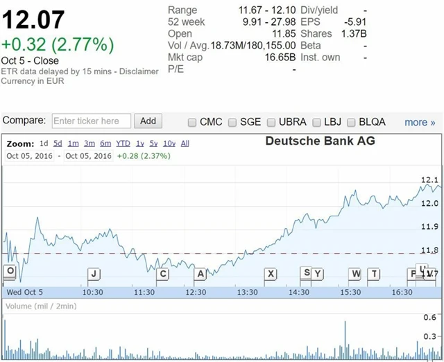 Cena akcií německé Deutsche Bank vzrostla o 2,77 % po zprávě německých novin Der Platow brief, že banka vyjednává o vyrovnání v hodnotě 4 až 5 miliard dolarů, ke kterému by mělo dojít na konci října.