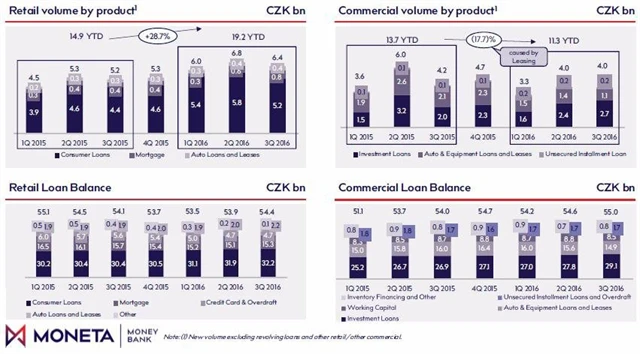"V průběhu prvních devíti měsíců roku jsme pokračovali v plnění svého plánu nastaveného při IPO, který spočívá v tom udržet si vedoucí pozici v českém bankovním sektoru a stát se hlavní preferovanou bankou pro malé a střední firmy v České republice. Zaznamenali jsme skvělé výsledky v objemech nových úvěrů v klíčových oblastech, včetně spotřebního financování, hypoték a úvěrů pro malé a střední firmy. V retailovém segmentu jsme se díky investicím do hypotečního bankovnictví a rozšíření základny hypotečních specialistů vrátili k růstu. V souvislosti s tím se snažíme dále vylepšovat svou pozici na českém trhu s retailovými úvěrovými produkty," uvedl ve výsledkové zprávě generální ředitel Monety Money Bank Tomáš Spurný.
