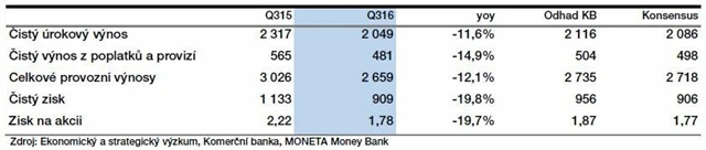 "Výsledky hospodaření Monety mírně zaostaly za tržním i naším očekáváním, na úrovni čistého zisku pak byly prakticky v souladu s trhem, avšak pod naším odhadem. V souladu s našimi predikcemi banka reportovala výši celkových provozních nákladů, zklamání se tak koncentrovalo do čistého úrokového výnosu a výnosu z poplatků a provizí, které zaostaly za našimi odhady. Za pozitivní lze ale označit další zlepšení kapitálové přiměřenosti a snížení podílu nesplácených úvěrů. Společnosti se daří naplňovat stanovené cíle. Za hlavní překvapení považujeme záměr managementu vyplatit 100-110 % letošního čistého zisku na dividendách (v poslední analýze jsme počítali se 70% výplatním poměrem), což by při našem celoročním odhadu znamenalo dividendu na úrovni zhruba 8 Kč na akcii, a tedy hrubý dividendový výnos bezmála 10 %. Ač výsledky byly celkově mírně slabší, oznámená výše dividendy je milým překvapením, a očekáváme tak pozitivní reakci ceny akcií," říká analytik z Komerční banky Richard Miřátský.