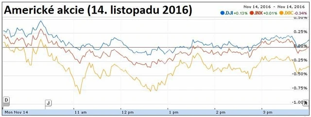 Dow nakonec zpevnil o 0,11 % na 18 868,69 bodu (absolutní rekord posunul na 18 934,05 bodu), zatímco širší S&P 500 klesl o 0,01 % na 2 164,20 bodu a Nasdaq Composite odepsal 0,36 % na 5 218,40 bodu. Index volatility VIX vzrostl o 2,19 % na 14,48 bodu a výnos 10letých vládních dluhopisů USA se zvýšil o téměř deset bazických bodů na 2,249 %.