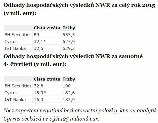 "O nové podnikové zprávy v úterý byla nouze, ve středu ráno budou zveřejněny výsledky hospodaření NWR. Těžební společnost sice asi zaznamená mírný růst tržeb, měla by ale zůstat ztrátová. Podle našich odhadů by navíc mohl výsledky ovlivnit velký účetní odpis majetku v řádu až několika miliard korun, který souvisí s plánovaným snížením objemu vytěžitelných uhelných rezerv ke konci roku 2015," uvedl analytik z Komerční banky Josef Němý. Akcie NWR posílily v úterý o 14,29 % na 0,08 Kč.