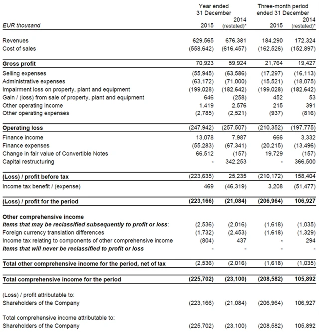 Za celý loňský rok se společnosti tržby snížily na 629,57 milionu eur z 676,38 milionu eur (-7 %), provozní ztráta se snížila na 247,94 milionu eur z 257,51 milionu eur a čistá ztráta se prohloubila na 223,17 milionu eur z 21,08 milionu eur. Na úrovni provozního zisku EBITDA (provozní zisk před úroky, daněmi, odpisy a amortizací) společnost vykázala záporný výsledek 4 miliony eur po kladném výsledku 11 milionů eur v roce 2014.
