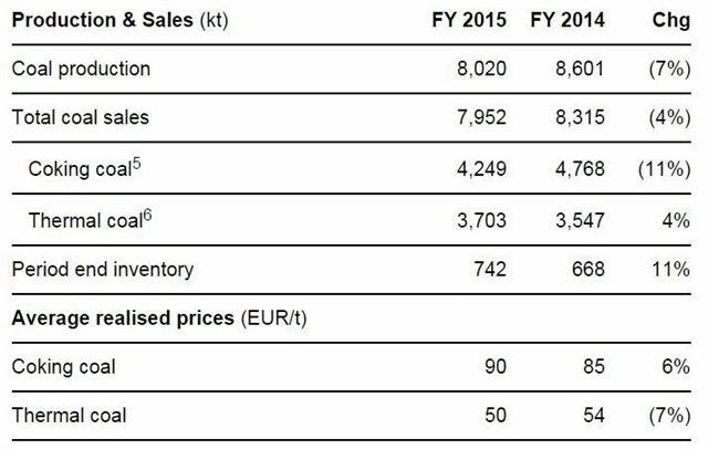 Celková produkce uhlí v loňském roce byla 8 milionů tun. Stejného objemu dosáhl i prodej uhlí. Produkce se meziročně snížila o 7 % a prodej o 4 %. Energetický mix se v loňském roce skládal z 53 % z koksovatelného uhlí a z 47 % z termálního uhlí.