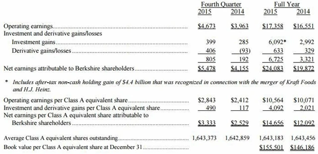 Berkshire Hathaway zároveň zveřejnila hospodářské výsledky za poslední loňské čtvrtletí a celý rok 2015. Provozní zisk firmy loni dosáhl 17,36 miliardy USD a čistý zisk 24,08 miliardy USD. V roce 2014 Berkshire hospodařila s provozním ziskem 16,55 miliardy USD a čistým ziskem 19,87 miliardy USD. Provozní zisk tak stoupl meziročně o 5 % a čistý zisk vyskočil o 22 %.