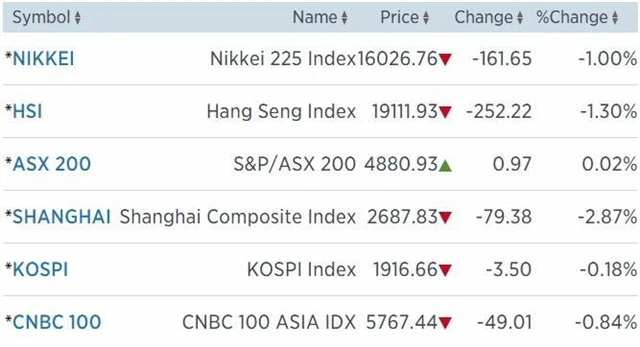 Ztrácely všechny významné trhy s výjimkou toho v Austrálii, který zůstal na zelené nule. Čínský Shanghai Composite se během dne obchodoval i ve ztrátě přes 4,5 % a dosedl tak na dno od roku 2014.