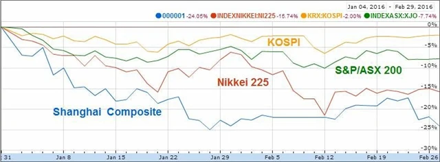 Za celý únor akciové trhy v Asii jako celek klesaly. Japonský Nikkei 225 odepsal 8,51 % a od začátku roku ztrácí 15,5 %. Shanghai Composite odepsal v únoru 1,81 % a za celý rok 2016 zatím klesá o 24,05 %. Korejský KOSPI v únoru přidal 0,24 %, od začátku roku ale ztrácí přes 2 %.