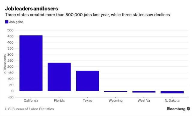 Klíčovým faktorem, který sleduje americký Národní úřad pro ekonomický výzkum (NBER) při hodnocení recese a expanze, je přírůstek a úbytek pracovních míst. Přestože v USA loni vzniklo 2,7 milionu pracovních míst, ve Wyomingu došlo k poklesu o 6 400 pracovních míst, v Západní Virginii o 11 800 a v Severní Dakotě až o 12 800.