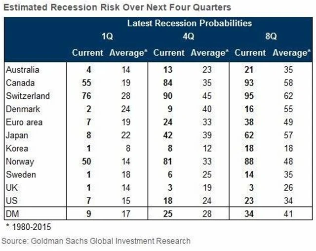 Podle predikčního modelu Goldman Sachs založeného na sadě dvaceti ekonomických a tržních indikátorů je aktuálně pravděpodobnost příchodu globální recese v následujících čtyřech čtvrtletích jen 25 % a v příštích dvou letech 34 %. Ve Spojených státech dosahuje pravděpodobnost příchodu recese v následujících 12 a 24 měsících 18 %, respektive 23 %.