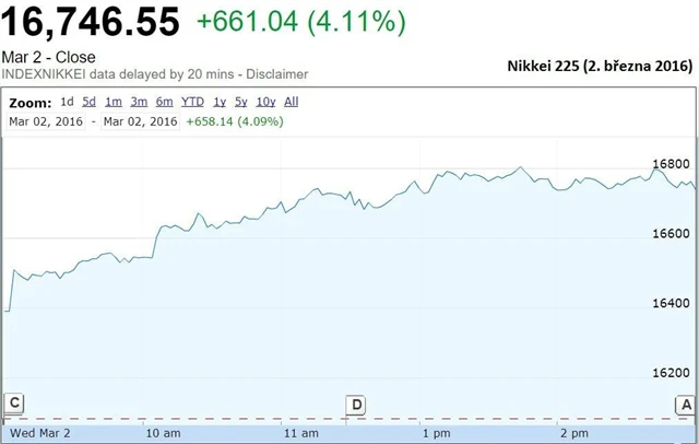 Nikkei 225 zpevnil ve středu o 4,26 %, zatímco jen se pohyboval kolem hladiny 114 USD/JPY.