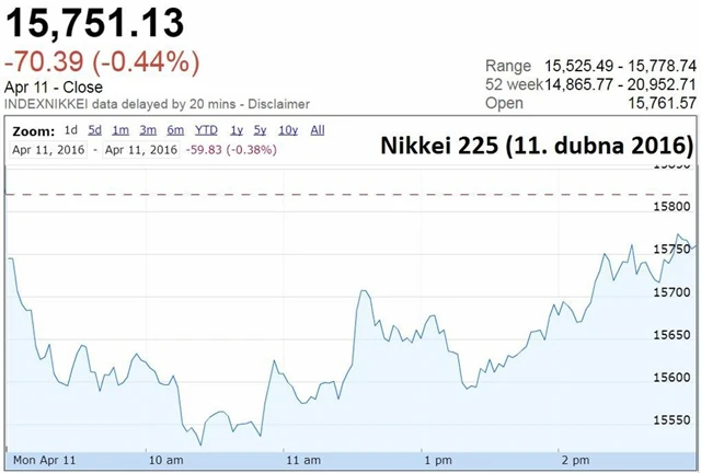 V Japonsku skončily výrazně pod nulou především akcie exportně orientovaných firem. Cenné papíry Toyoty odepsaly 3,46 %, akcie Nissanu zlevnily o 1,69 %, akcie Hondy o 2,08 % a cenné papíry Sony den zakončily se ztrátou 3,73 %. Srážel je silný jen, který snižuje hodnotu jejich výsledků ze zahraničí.