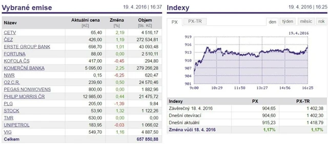 Index PX v úterý připsal 1,17 % na 915,23 bodu.