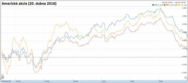 Americké akcie v úvodu rostly, index Dow v 15.50 SELČ posiloval o 0,11 %, S&P 500 přidával 0,07 % a Nasdaq Composite zpevňoval o 0,17 %. Index PX ve stejnou chvíli klesal 0,18 % na zhruba 914 bodů, akcie Erste odepisovaly 1,82 %, zatímco ČEZ naopak o 0,56 % posiloval. FTSE 100 před 16.00 klesal o 0,3 %, zatímco DAX rostl o 0,14 % a CAC 40 přidával 0,08 %.