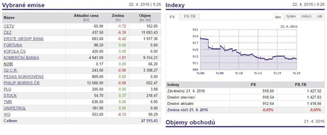 Index pražské burzy PX se v první půlhodině pátečního obchodování propadal o téměř šest bodů (-0,65 %). Ve ztrátě byly téměř všechny obchodované tituly. Nejhůře se vedlo akciím Komerční banky a CME. Akcionáři KB budou na valné hromadě rozhodovat o vyplacení dividendy v hrubé výši 310 Kč na akcii (aktuálně již se akcie společnosti obchodují bez nároku na dividendu).
