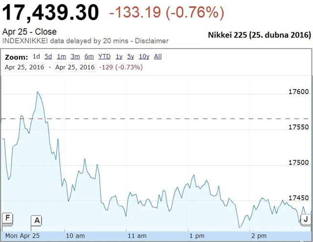 Japonský Nikkei 225 odepsal 0,76 % na 17 439,30 bodu, a přerušil tak pozitivní rally z minulého týdne, která mu vynesla 4,3 %.