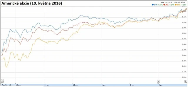 Dow posílil o 1,26 % na 17 928,35 bodu, širší S&P 500 připsal 1,25 % na 2 084,39 bodu a Nasdaq Composite uzavřel se ziskem 1,26 % na 4 809,88 bodu. Index volatility VIX klesl o 6,59 % na 13,63 bodu a výnos 10letých vládních dluhopisů USA se mírně zvýšil na 1,753 %.