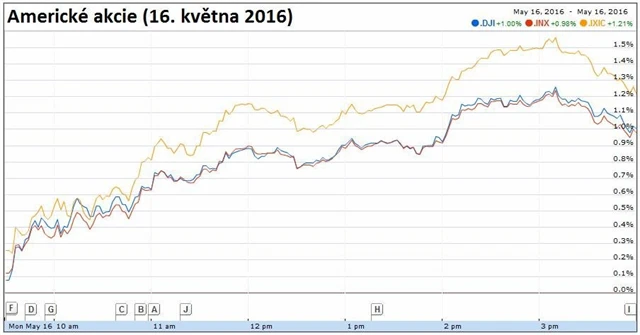 Index Dow zpevnil o procento na 17 710,71 bodu, širší S&P 500 přidal 0,98 % na 2 066,66 bodu a Nasdaq Composite uzavřel se ziskem 1,22 % na 4 775,46 bodu. Index volatility VIX klesl o 2,39 % na 14,68 bodu a výnos 10letých vládních dluhopisů USA se zvýšil o pět bazických bodů na 1,752 %.