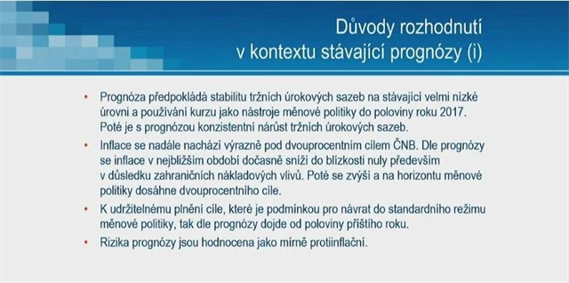 14.22 Singer: Naše rozhodnutí se opírá o novou prognózu, která předpokládá stabilitu sazeb na stávající velmi nízké úrovni a používání kurzu jako nástroje měnové politiky do poloviny roku 2017.